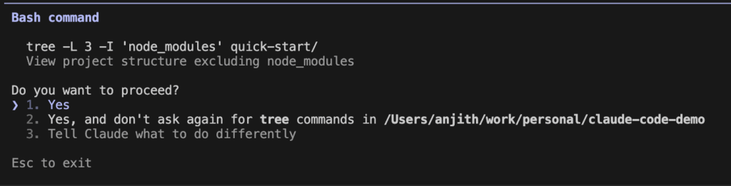 When Claude requests permission to run a command, you have three options: